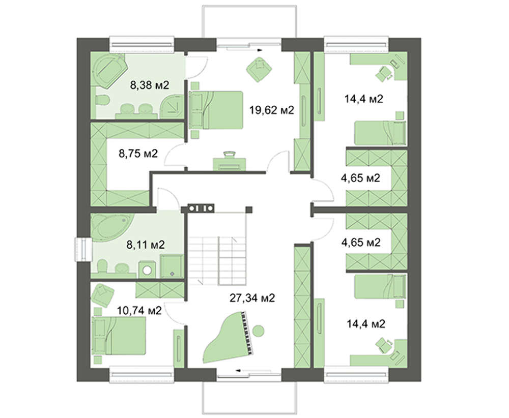 Четыре спальни второго этажа отличаются размерами и площадью. Каждая из них по-своему удобна и уникальна. Хозяева домовладения имеют возможность выбирать помещения согласно личным предпочтениям. Два балкона будут дополнительным преимуществом.