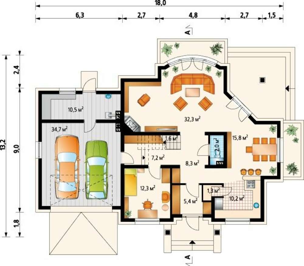 Внутреннее пространство особняка максимально функционально. Здесь нет четкого поэтажного деления на дневную и ночную зону. Так, на нижнем уровне находится спальня, а на верхнем — помещения для развлечений. Центральное место первого этажа отведено гостиной. Это просторный зал площадью более 30 кв. м. с большим настоящим камином и зимним садом в эркере.  Возле «очага» установлены удобные кресла и лежит медвежья шкура. Долгими осенними вечерами здесь часто собирается дружная семья, рассаживается поудобнее и любуется, как языки пламени лижут сухие дрова, превращая их в угли.