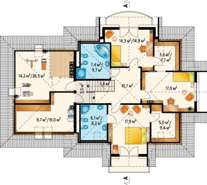 Второй этаж представлен тренажерным залом, биллиардной, двумя спальнями с общим помещением для переодеваний, санузлом и апартаментами повышенной комфортности владельца особняка. Они включают собственный гардероб и ванную комнату. Все спальни имеют отдельный балкон в эркере
