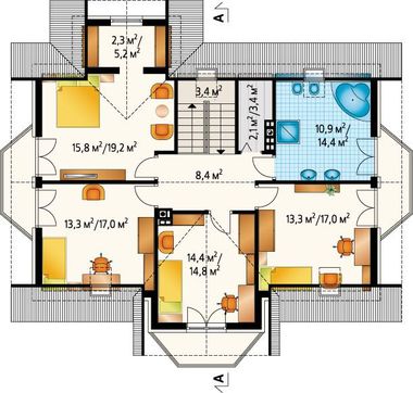 Внутренне пространство дома отличается своей рациональностью. Оно поэтажно разделено на две зоны: дневную и ночную. Последняя включает четыре спальни для членов семьи улучшенной планировки с выходом на балкон и общую санитарную комнату.