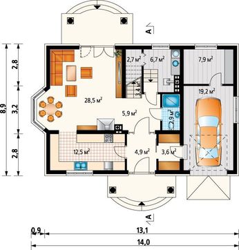 Другую сторону этажа занимает гараж для автомобиля представительского класса и домашняя мастерская. В центральной части уровня находиться совмещенный санузел, холл с лестницей на второй этаж, под маршем которой обустроена котельная. Помещение дополнительно используется как прачечная. Часть площади отдана под прихожую и гардероб.
