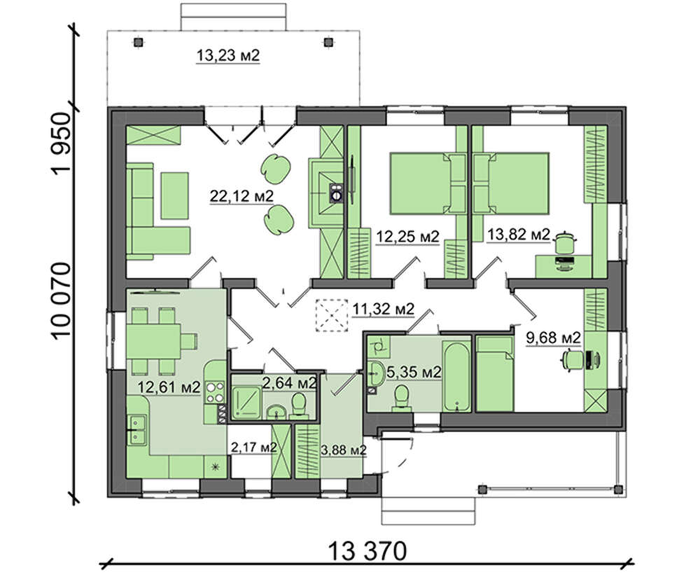 Проект содержит три раздела – АрхитектурныйКонструктивный и Инженерный: водоснабжение, отопление, вентиляция, канализация, электроснабжение (приобретается за дополнительную плату) + Пояснительная записка.