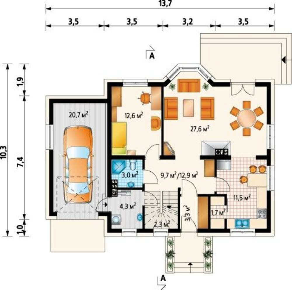 Под своею крышей здание объединяет все требуемые для комфортного проживания помещения. Гаражное пространство рассчитано на размещение одного автомобиля, расположенная рядом комната может быть использована для хранения механических приспособлений и инструментов.