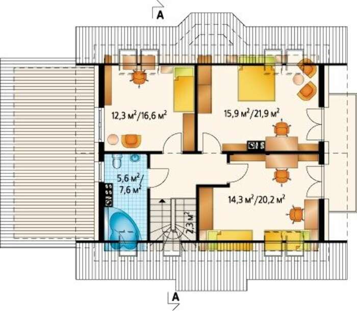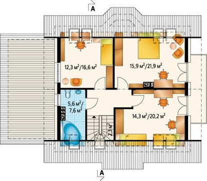 Значительная часть площади отведена под отдых домочадцев. Предусмотрено четыре комнаты, покои первого этажа по желанию владельцев можно использовать как кабинет или спальню.