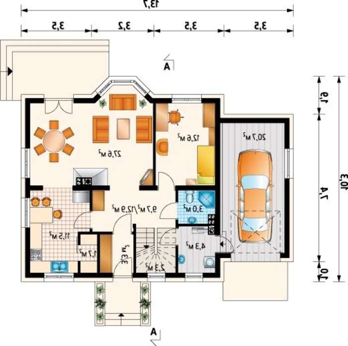 Особенность первого этажа в четком разграничении зон. Место приготовления пищи, комната для отдыха и гостиное помещение отделены друг от друга. Наиболее красивая часть зоны приема друзей включает эркер. Практически на всю высоту стены окна наполняют помещение светом и картинами природы, одновременно придавая торжественный вид. Такие строения рассчитаны на дружеские приемы, которые благодаря выходу на внешний простор легко переносятся на загородный участок.