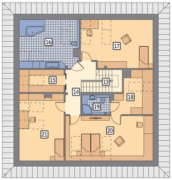 Мансардный этаж является территорией сна. Здесь находятся комнаты отдыха разного уровня комфортности для каждого жильца, гардероб и совмещённый санузел с массажной ванной типа джакузи.