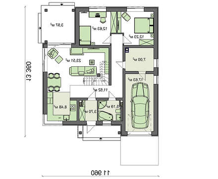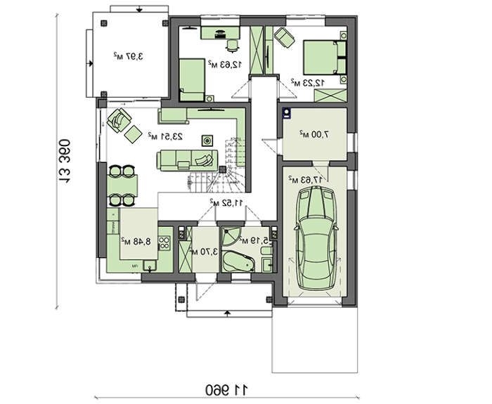 Первый этаж включает все необходимые для проживания помещения. Встроенный гараж рассчитан на содержание одной единицы транспорта, примыкающую топочную можно использовать для хранения инструмента и выполнения работ по обслуживанию автомобиля. Для проведения личного времени и отдыха в плане предусмотрены две спальни площадью по 11 квадратов каждая.