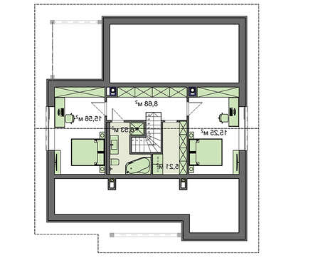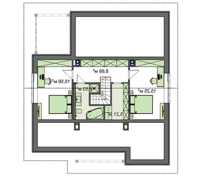 Согласно проекту, второй этаж включает две равноценные спальни, общий холл можно использовать для отдыха и размещения шкафов-купе.
