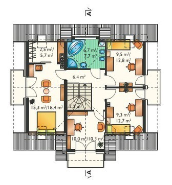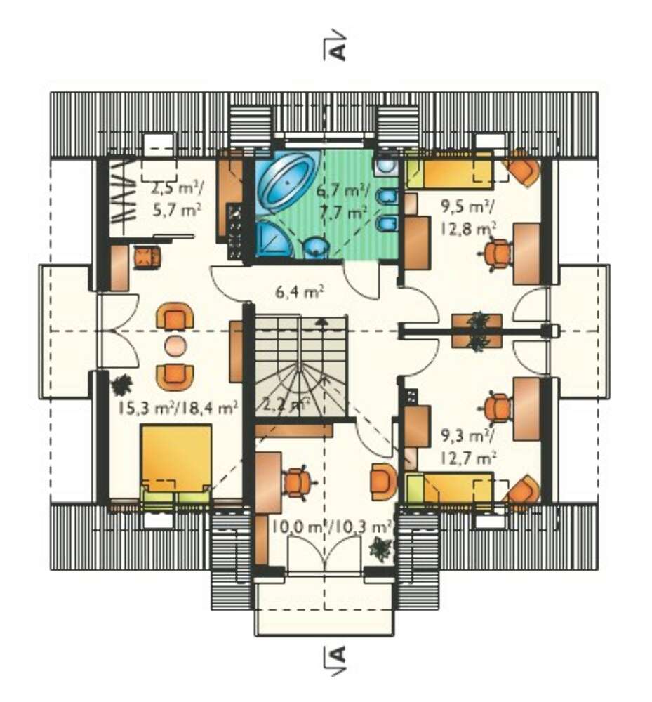 Особенность жилого дома в наличие большого количества спален, которые так необходимы для немалой семьи. Они разнесены на два этажа, отдельная комната первого может быть отдана для старшего поколения семьи или людей с ограниченными возможностями.