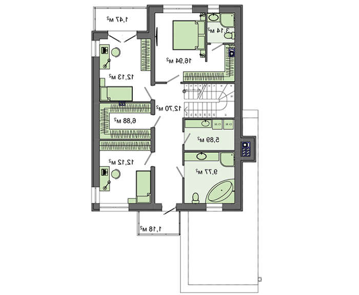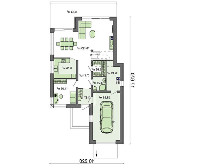 Под крышей первого этажа определено место для просторного гаража под размещение одного автомобиля. Площадь в шесть квадратов позволит установить все необходимое для сервисных работ оборудование, и здесь же выполнять мелкие строительные и слесарные операции. Отдельное помещение можно использовать как кабинет для важных деловых переговоров или площадку детских игр. Любое из решений правильное, любящий муж всегда накормлен, а дети находятся под маминым присмотром.