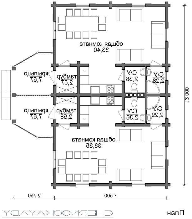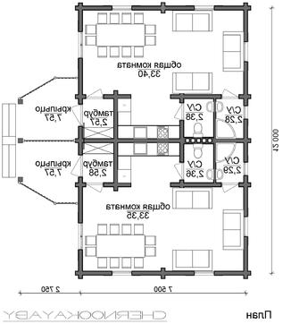 Внутренняя планировка дома разделена пополам, причем одна часть зеркально повторяет другую. Центральное место таунхауса занимает общая комната33,4 кв. м. Она выполняет функцию гостиной и столовой. Здесь установлена шикарная мягкая мебель для отдыха и банкетный стол.Кухня примыкает к залу. Здесь обустроена современная рабочая стенка с бытовой техникой последнего поколения. Остальную площадь занимает небольшой тамбур со шкафом-купе для верхней одежды гостей, туалет и душевая.