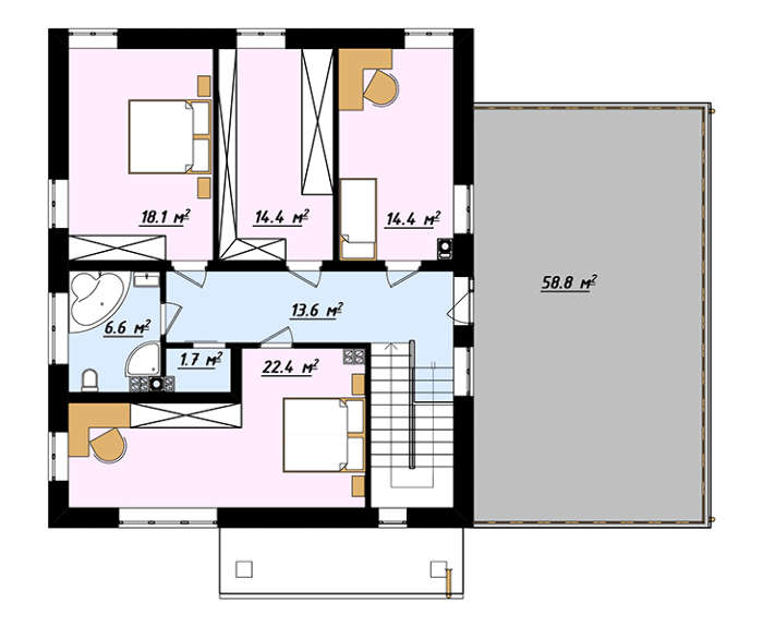 Второй этаж включает 4 комнаты для отдыха. Они отличаются размерами, планировкой. Предусмотрены места под гардеробы. Санузел площадью в 6,6 кв. м рассчитан на передовое сантехническое оборудование. Особенность второго этажа в просторной террасе. Ее огромная площадь более 50 кв. м позволяет установить спортивные снаряжения, рассадить деревья в кадках. Расставив удобную дачную обеденную мебель, можно получить отличное место для чаепитий на свежем воздухе.