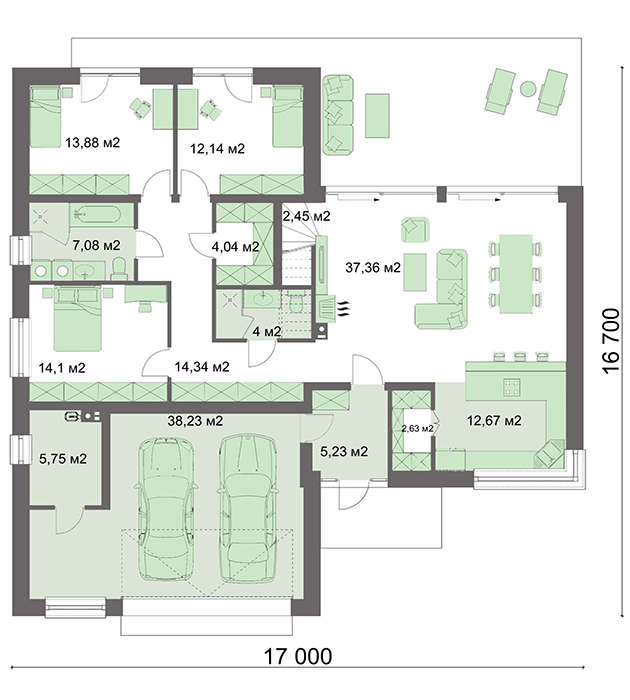 Просторный гараж рассчитан на хранение и обслуживание 2 единиц транспорта. Спальни первого этажа имеют размеры от 13 квадратов, в двух помещениях предусмотрены выходы прямо на веранду, такая планировка понравится свободолюбивым членам семьи, которые получают возможность покидать коттедж незамеченным.