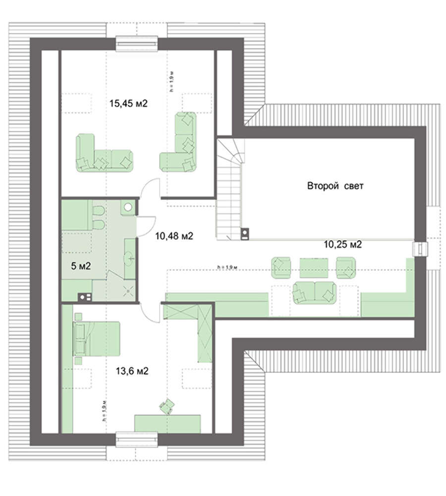Особенность жилого дома в огромном просторе, который встречает любого входящего на второй этаж. Предусмотренные планом две комнаты можно обстроить согласно своим предпочтениям