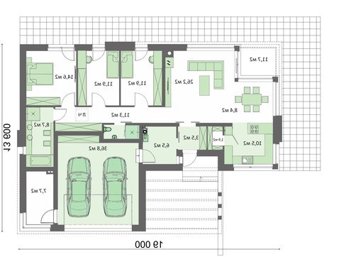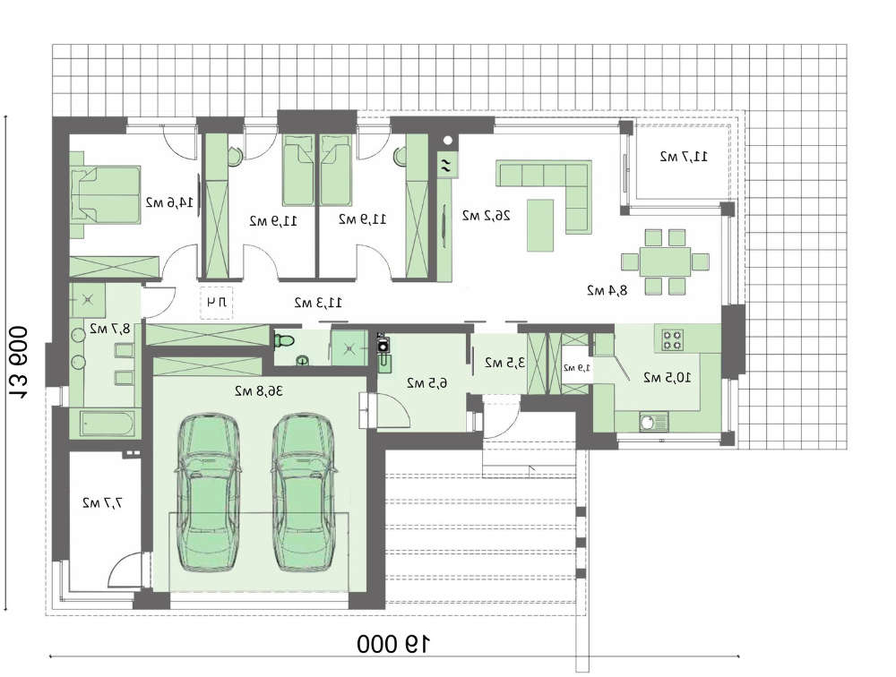 Одноэтажные особняки особенно нравятся своей простотой и функциональностью. Удобства одного уровня исключают необходимость частого перемещения с этажа на этаж. Несмотря на то что здесь все рядом, жилой дом четко разделен на спальную и гостевую зоны. Три спальни практически одной площади создают приблизительно равные условия для всех членов семьи. Хозяйские апартаменты имеют чуть большие размеры и удобное размещение в самой дальней части, подальше от гаража.