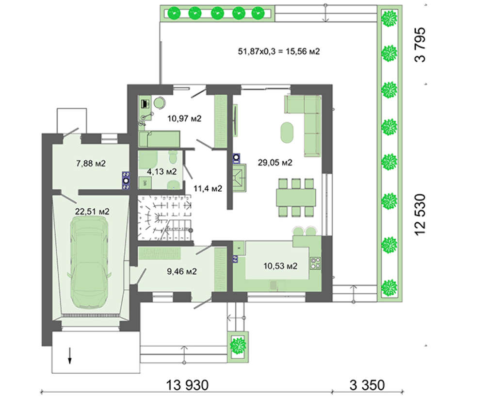 Первый этаж включает обязательные помещения, где семья собирается и вместе проводит время. Удобный гараж получит достойную оценку со стороны водителя-автолюбителя. Все технические и сервисные вопросы по обслуживанию решаются в специально отведенном под мастерскую помещении.
