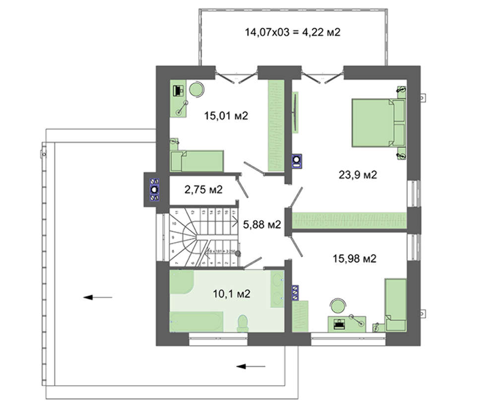 Спальных помещений три, они все на втором этаже. Отличаются площадью, хозяин домовладения может подобрать любое по своему усмотрению. Просторная комната отведена под санитарные нужды, ее габариты рассчитаны на размещения лучшего оборудования. Небольшое отдельное помещение легко вместит самый обширный запас одежды.
