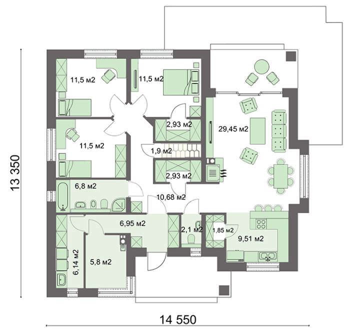 Кроме традиционных комнат, запроектированы отдельные гардеробные, прачечное помещение. Имеется два санитарных узла для решения естественных нужд. При желании, имеющееся чердачное помещение, можно переоборудовать в дополнительную жилую площадь.