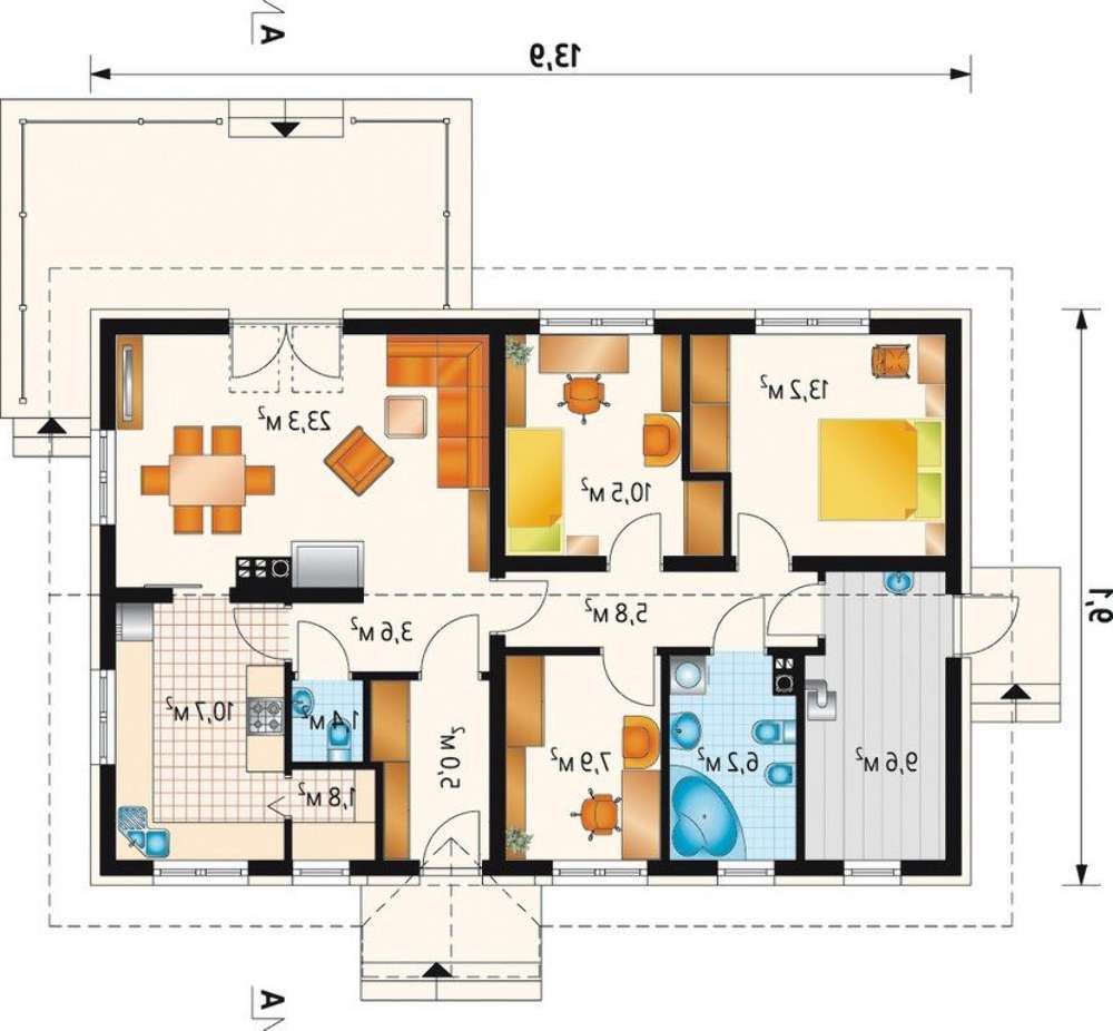 Великолепный одноэтажный коттедж в европейском стиле станет украшением любого участка. Он идеально вписывается даже в габариты стандартного дачного надела в 6 соток. Поэтому проект используют как для круглогодичного, так и для сезонного жилья.