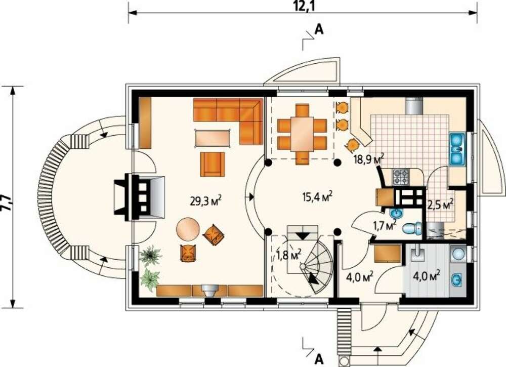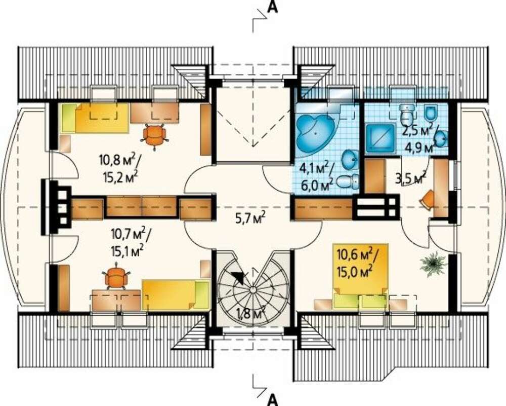 Великолепный дом с мансардой и двумя балконами в европейском стиле понравится застройщику-эстету. Красивое сочетание желтых стен, алой двухскатной крыши и белоснежных балконов создают неповторимое ощущение вечного праздника. Кровля аккуратно обрамлена серой лобовой доской, что несколько ограничивает «пылающую» гамму. Цоколь облицован плиткой из натурального камня. Конструкция белых оконных блоков выполнена в виде арок и прямоугольников. Входные двери деревянные, аналогичного цвета. Портал представляет низкое бетонное крыльцо с тремя ступенями и небольшим навесом основной кровли.