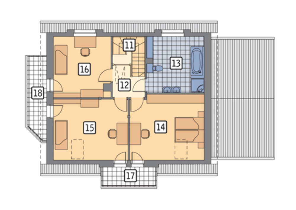 На уровне находиться прихожая, коридор с лестницей наверх, санузел и технический блок, включающий гараж для хранения автомобиля и котельную. Мансардный этаж предназначается для личных спален членов семьи. Все три комнаты имеют выходы на балкон. Остальную площадь занимает небольшой коридор и санузел.
