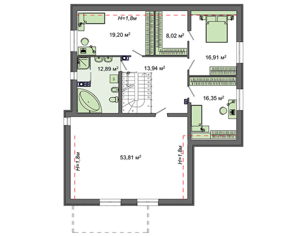 Из запроектированных четырех спален, одна находится на первом этаже и может быть использована как личное помещение старшего поколения, так и деловой кабинет. Спальни второго уровня выходят в просторный холл, где поместятся диванчики и кресла для общего отдыха. Апартаменты хозяина отличаются большим комфортом, который достигается за счет собственного гардероба.