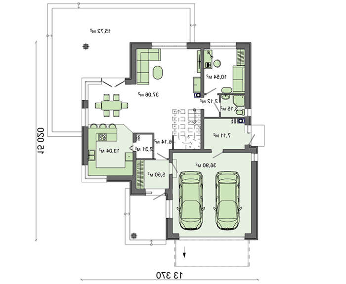 Г-образную наружную планировку повторяет гостиная, соединяющая кухню, столовую и места отдыха в одну студию. Зоны отдыха и приготовления пищи разнесены как можно дальше, чтобы позволить полноценно отдыхать и трудиться. Рядом с кухней имеется кладовка для хранения инвентаря и пищевых припасов.