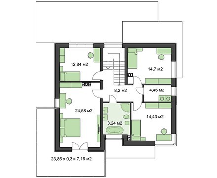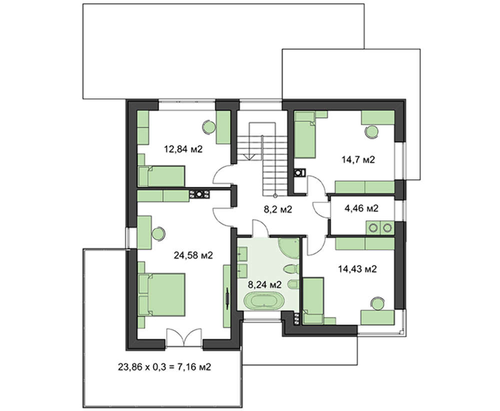 Под личные апартаменты отдан второй этаж Четыре комнаты рассчитаны на проживание большой семьи. Двое санитарных помещений помогут решения естественных потребностей. Апартаменты хозяина выделяются за счет большей площади, имеет выход на просторную веранду.