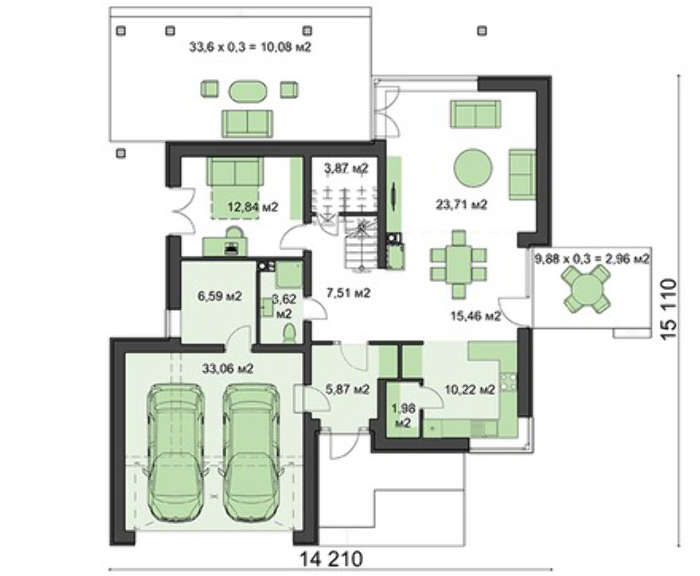 Первый этаж включает помещения разного назначения. Гараж может быть использован для содержания двух единиц транспорта. Место отдыха отличается простором и объемом, что достигнуто за счет отсутствия стен между кухней, столовой и гостиной. Для приготовления еды выделено наиболее отдаленная ее часть, такая планировка защищает комнаты от излишних пищевых запахов. Имеется место для уголка отдыха, предусмотрен санузел.