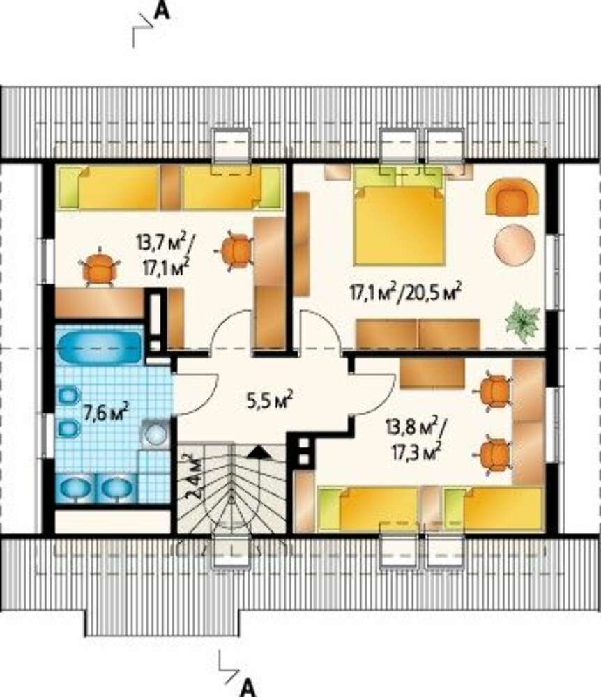 Несмотря на небольшие внутренние размеры, здесь смогло разместиться все необходимое. В трех больших спальных комнатах, если потребуется, найдется место для немалых гардеробов обитателей, что позволит им комфортно проводить свободное время. Первый этаж общий, он выделен для приема гостей и бесед друзей. Совместное помещение тактично раздроблено на зоны. Такая планировка позволяет максимально отодвинуть гостиную от места, где царят вкусные запахи кухни.