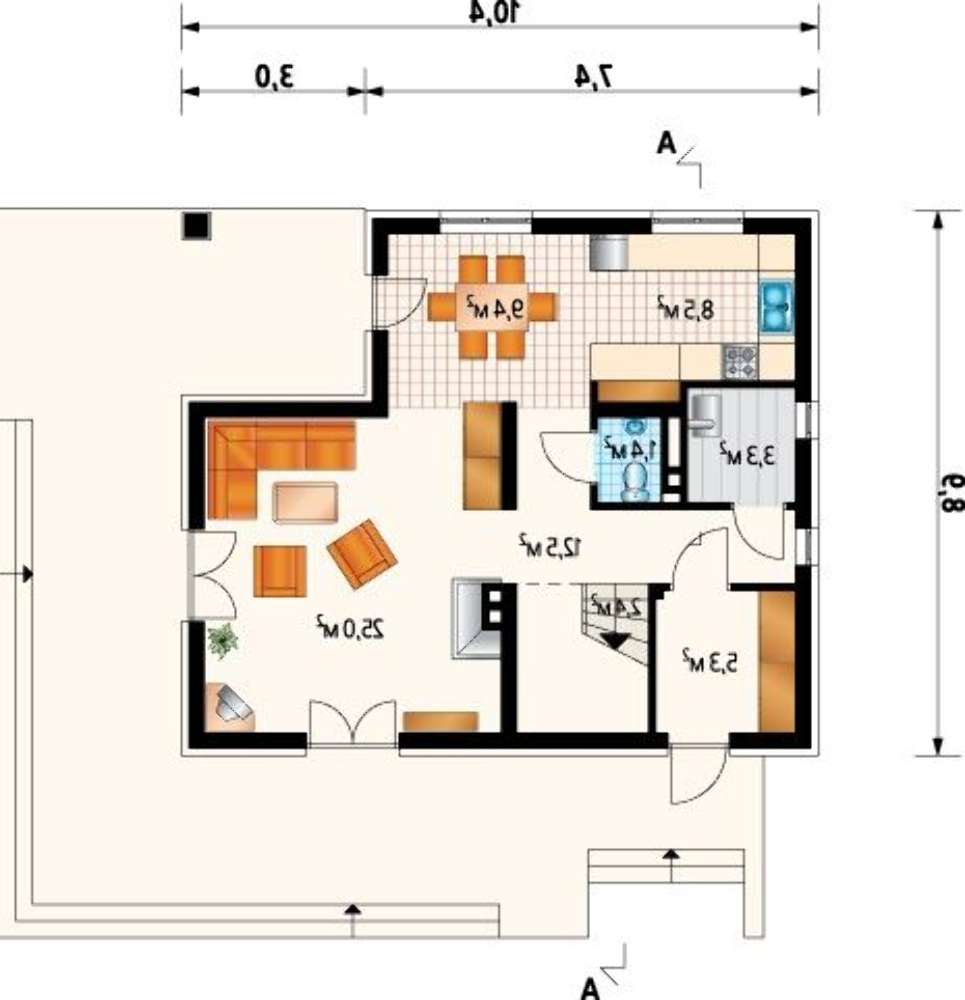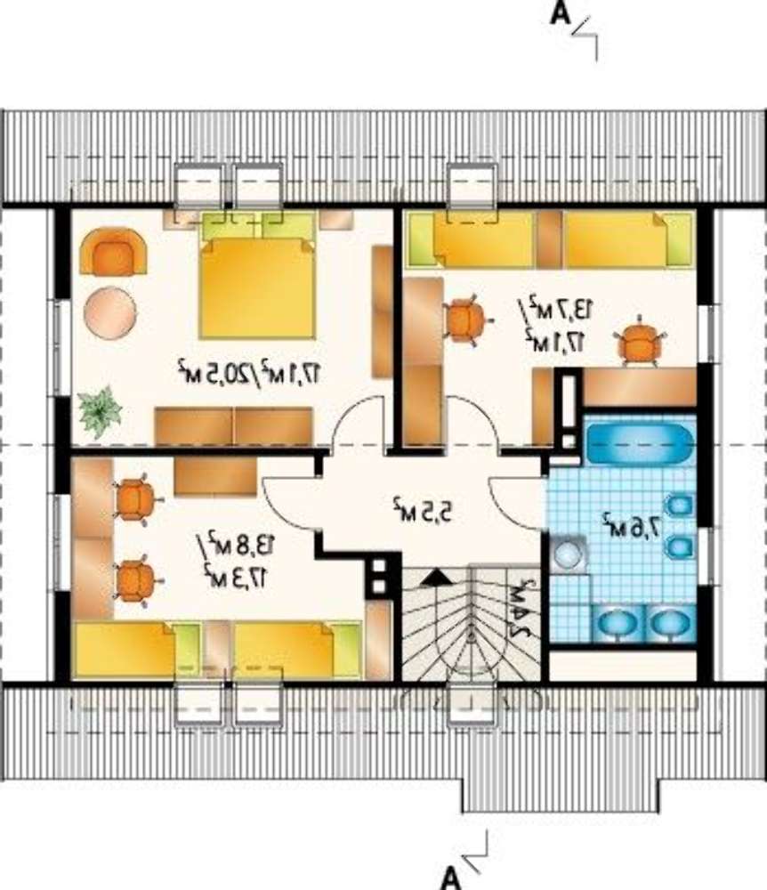 Несмотря на небольшие внутренние размеры, здесь смогло разместиться все необходимое. В трех больших спальных комнатах, если потребуется, найдется место для немалых гардеробов обитателей, что позволит им комфортно проводить свободное время. Первый этаж общий, он выделен для приема гостей и бесед друзей. Совместное помещение тактично раздроблено на зоны. Такая планировка позволяет максимально отодвинуть гостиную от места, где царят вкусные запахи кухни.