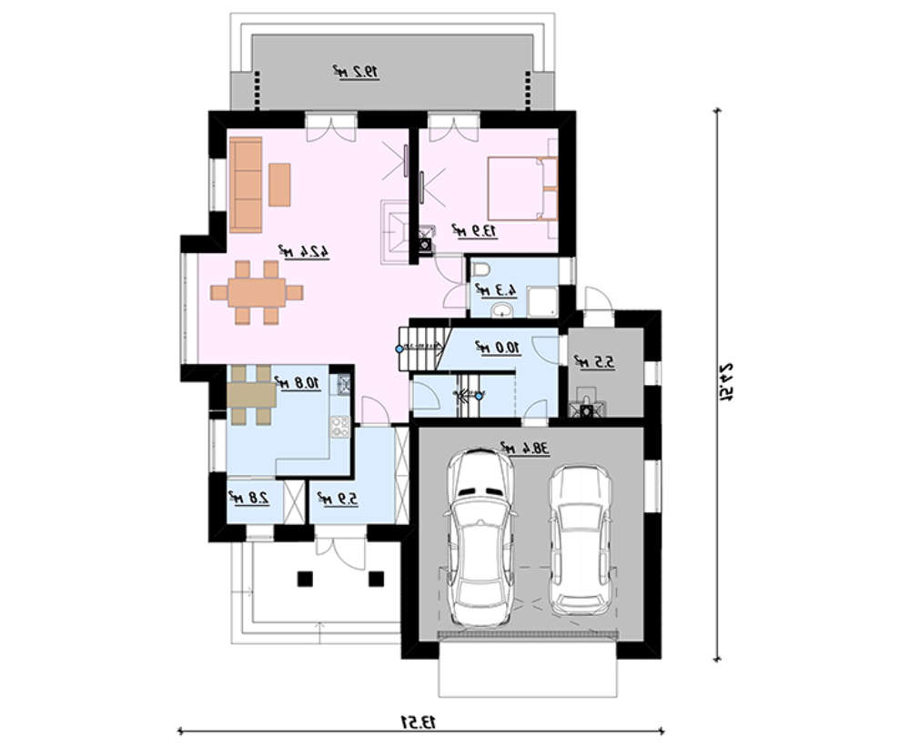 Первый этаж интересно разделен на помещения. Просторный гараж помещает два автомобиля. Предусмотрена отдельна комната под мастерскую. Большая часть этажа запланирована под гостиную. Она просторная и красивая. Эркерную часть рекомендуется отдать под обеденный стол. В окружении прекрасных пейзажей, настроение и пищеварение значительно повышается.