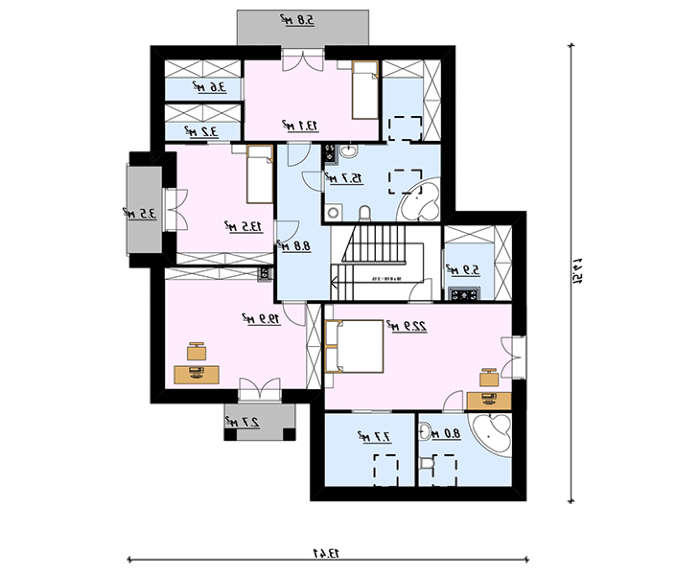 Четыре спальни на втором этаже абсолютно уникальные. Каждая имеет свои габариты и планировку. В зависимости от расположения, может включать личный гардероб, санузел. Три балкона разной площади настраивают обитателей на лирический лад. Выходят на разные стороны, обитатели не видят друг друга. Такая планировка позволяет почувствовать уединение и устраивать романтические встречи рассвета и наблюдения за закатом.