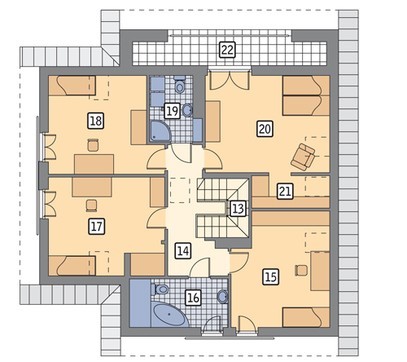 Мансардный уровень — это «святая святых», здесь расположены личные спальни членов семьи. Их четыре, одна, из которых имеет собственный гардероб. На этаже предусмотрены два санузла.