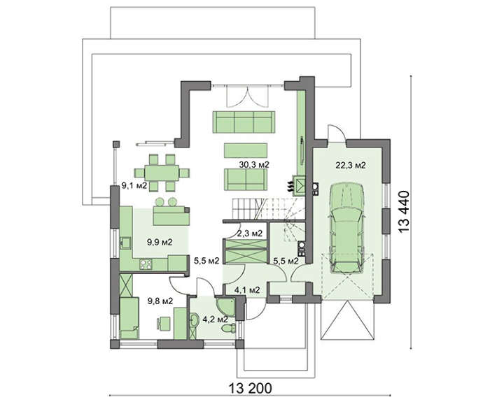 Первый этаж состоит из трех блоков, разнесенных в разные части коттеджа. Планировка помогает членам семьи отдыхать, встречать гостей и заниматься ремонтом автомобиля независимо друг от друга.