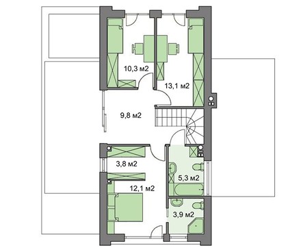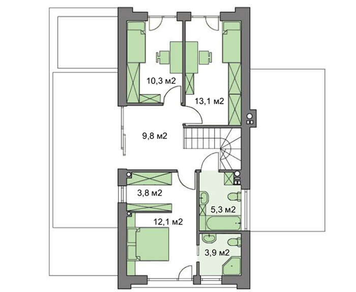 Спальных комнат четыре. Для удобства и большого выбора они разнесены на разные этажи. Несмотря на малые размеры спальня первого уровня удобная, находится рядом с гардеробом и санузлом. Комнаты второго этажа отличаются площадью и планировкой. Апартаменты хозяина особо выделены. Здесь имеется индивидуальный санузел, гардероб.