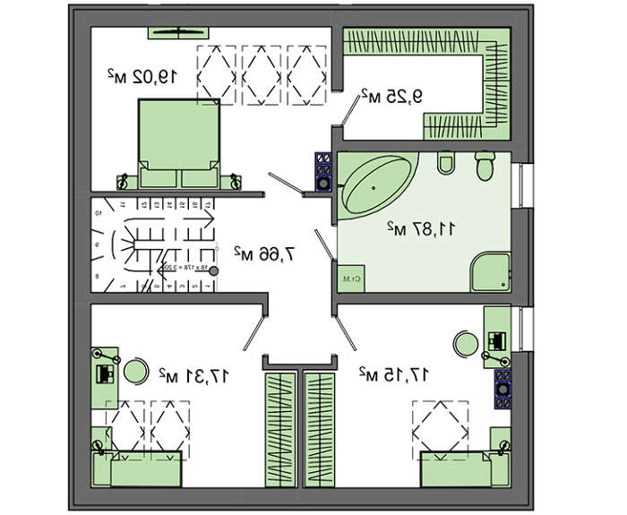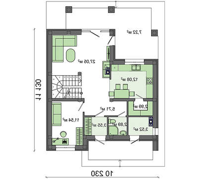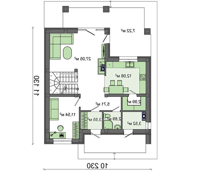 Планировка строения рассчитана на дружеские встречи, шумные молодежные вечеринки и детские веселые утренники. Большая часть первого этажа отдана под гостиную. Для удобства и получения просторной площади все требуемые для приема гостей пространства соединены вместе. Рядом с живым огнем камина разговоры приобретают теплоту и дружественность, встречи влюбленных наполняются романтикой, а семейные беседы сплачивают.