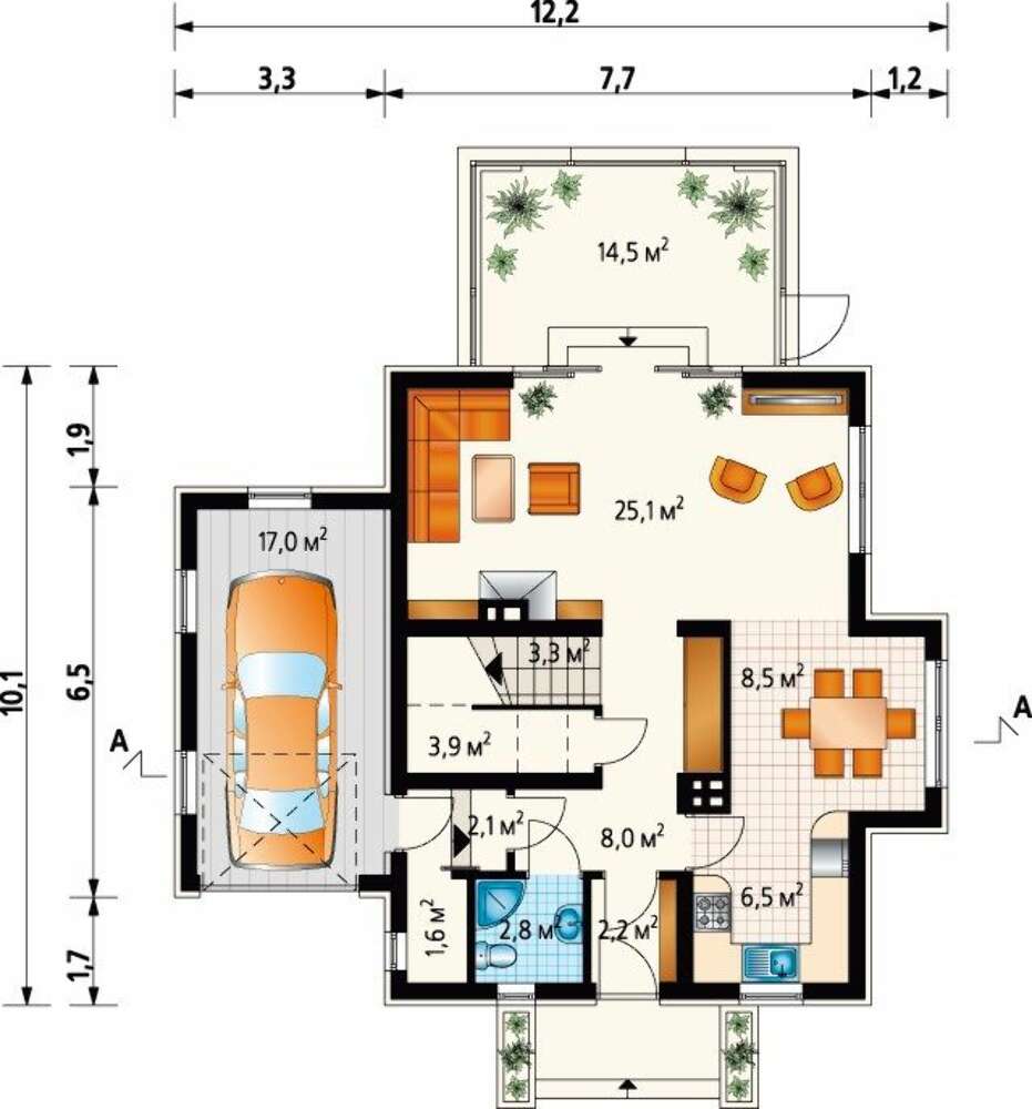 Первый этаж готов к встрече гостей по максимуму. Большое общее пространство условно разделено на зоны, каждая из них позволяет почти уединенно заниматься делами, для которых предназначена. Дополнительные удобства создает гараж, место для которого найдено тут же, под крышею дома.