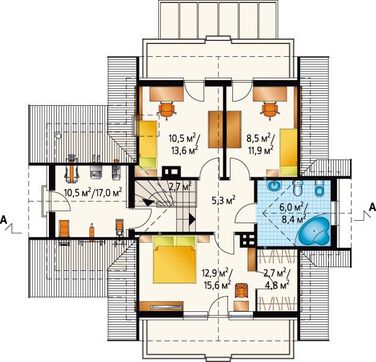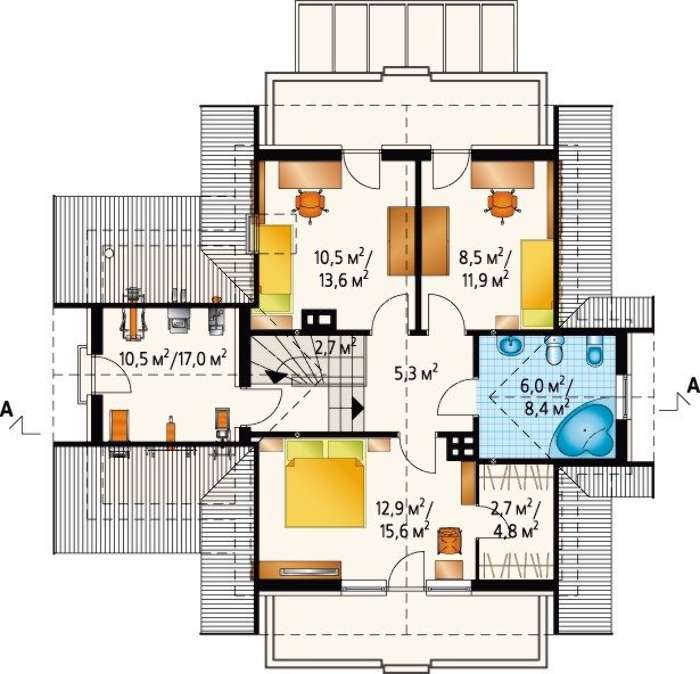Приятная неожиданность кроется в планировке второго этажа. Размещенные здесь три комнаты позволяют в пространстве поместить всю необходимую мебель для отдыха. Наличие балкончиков пригодится для любования закатами и восходами или романтического поглядывания вдаль при появлении мечтательного настроения.