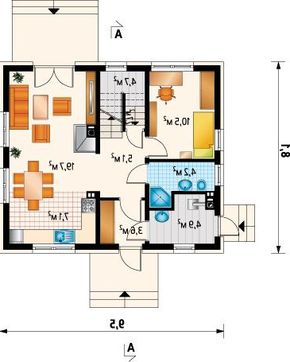 Компактный дом с мансардой придется по вкусу большой и дружной семье. Он не займет много места, поэтому подойдет даже для городской застройки, где приобрести просторный участок — большая проблема. Еще один критерий популярности проекта — экстерьер дома. Еще издали его можно узнать по красной крыше. В шикарном сочетании со средне–бежевым цветом стен она просто очаровывает и завораживает. Коробка дома, как бы усиливает «пожар», но он не расходится, его сдерживает фронтонный фартук и лобовые доски серого цвета. Мансардные окна и дымоходы такого же тона не только приглушают «горение», но и придают экстерьеру нотки благородства и процветания. Красиво смотрятся белые наличники, обрамляющие деревянные оконные блоки и двери желтого цвета. Они выражают элегантность и сдержанность, а сами рамы составляют со стенами нежную, невинную гамму. Черный цоколь и фрагмент из декоративного камня словно подводит черту этого шедеврального архитектурного ансамбля.