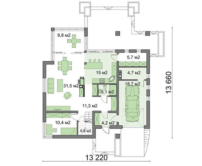 Пространство первого этажа универсально. Найдено место для гаража и небольшой домашней мастерской, для частного дома это необходимость. Небльшая комната площадью в 10 квадратов станет пристанищем для загулявшего гостя или спальней для члена семьи преклонного возраста. На этаже расположена небольшая прихожая и санузел. Остальная площадь в 70 м2 отдана под помещения отдыха и места для приготовления пищи.