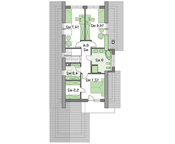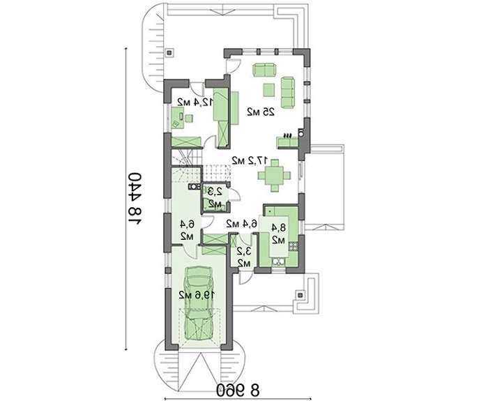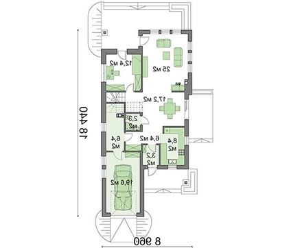 Несмотря на то что жилой дом прекрасно впишется в любой узкий участок, внутреннее пространство лишено вытянутых длинных помещений. Первый этаж включает комнаты разного назначения. Наибольшая часть отдана под гостиную. В ее составе предусмотрена столовая. Два выхода на загородную территорию позволяют легко погружаться в атмосферу цветов и растений и бесконечно долго наслаждаться загородной природой в полузащищенном пространстве веранд.