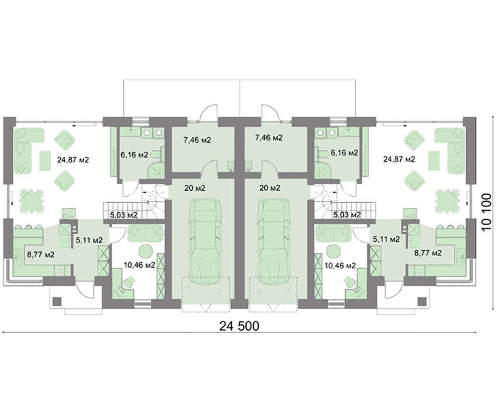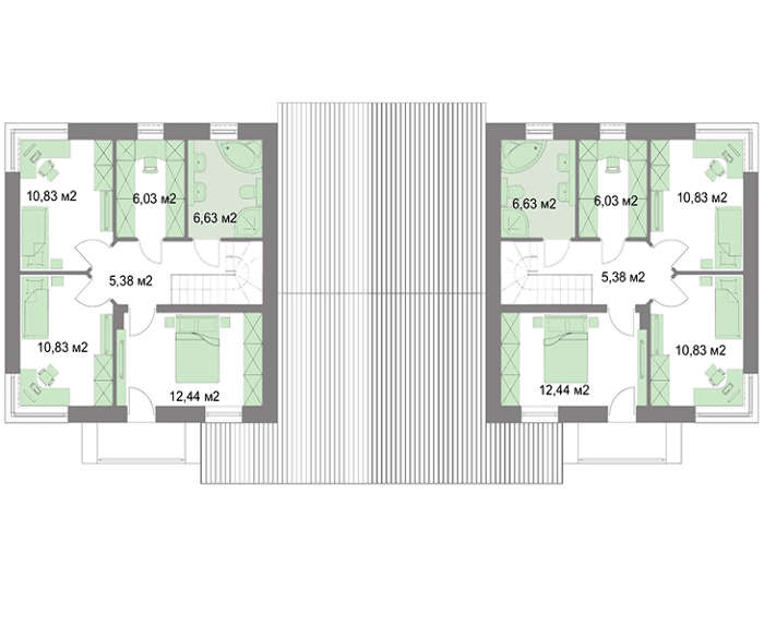 Для оформления фасада выбраны в тон четырехскатной кровле приятные шоколадные оттенки. Для того чтобы менее мешать друг другу, квартиры не соприкасаются по жилой площади. Общая кровля объединяет только гаражные помещения на один автомобиль каждое.