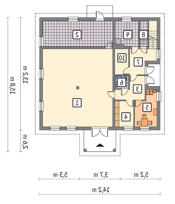 Приветливый дом задуман как торговое помещение и небольшая мини-гостиница одновременно. Первый этаж можно использовать под магазин, аптеку, косметический салон или парикмахерскую. Большую часть уровня занимает торговая площадь. К ней примыкает солидная комната, которую удобно использовать под складское помещение. Преимущество такого разделения в том, что на хранилище имеется отдельный вход для поставщиков продукции.
