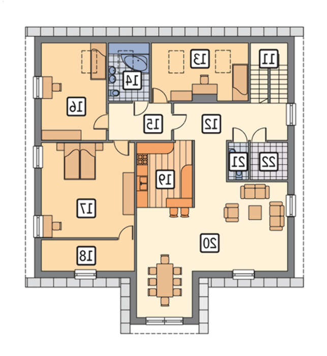 Общая гостиная условна разделена на три части. Кухня поможет любителям домашней пищи приготовить нехитрые завтраки и обеды, заварить чашечку крепкого утреннего кофе. В эркерную часть отнесена столовая. В этом красивом месте этажа обеденный стол выглядит наиболее органично. Предусмотрена зона отдыха, для меблировки которой потребуются диванчики и кресла.