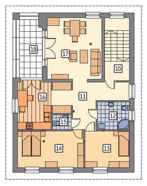 К балкону примыкает кухня. Она имеет отдельный вход, что удобно при сервировке стола.  Места достаточно для размещения новейшей бытовой техникой. Здесь же можно установить стол для повседневных трапез. Остальная площадь этажа отведена под личные спальни членов семьи, туалет и ванную комнату.