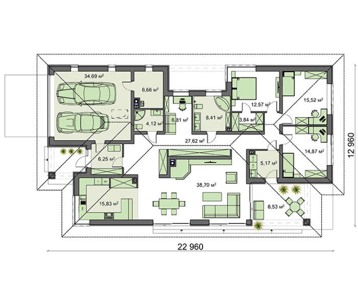 • 4M755 Просторный одноэтажный жилой дом с гостиной в центре