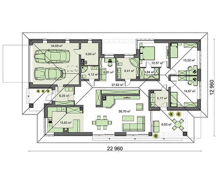 Модная планировка получит достойное уважение от хозяев-автолюбителей. Большое пространство выделено под гараж, на его территории легко разместятся две машины. Предусмотрено место под мастерскую.