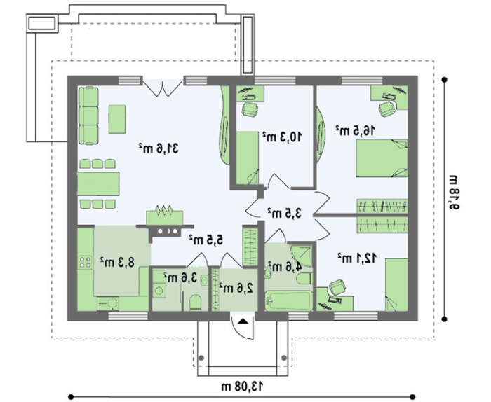 Одноэтажный дом с террасой полезной площадью 100 м2 выполнен в традиционном стиле. Несмотря на небольшие размеры, здесь есть все для комфортного проживания 3-4 человек.