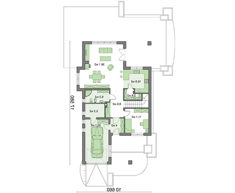 Небольшая ширина дома позволяет его использовать для узкого участка. Первый этаж включает все требуемые для комфортного проживания помещения. Гостиная зона соединила вместе кухню, столовую и место для приема гостей. За счет этого слияния получено огромное пространство без перегородок, наполненное светом. Удобно сформирована зона приготовления пищи, в ее площадь включена кухня и кладовка.
